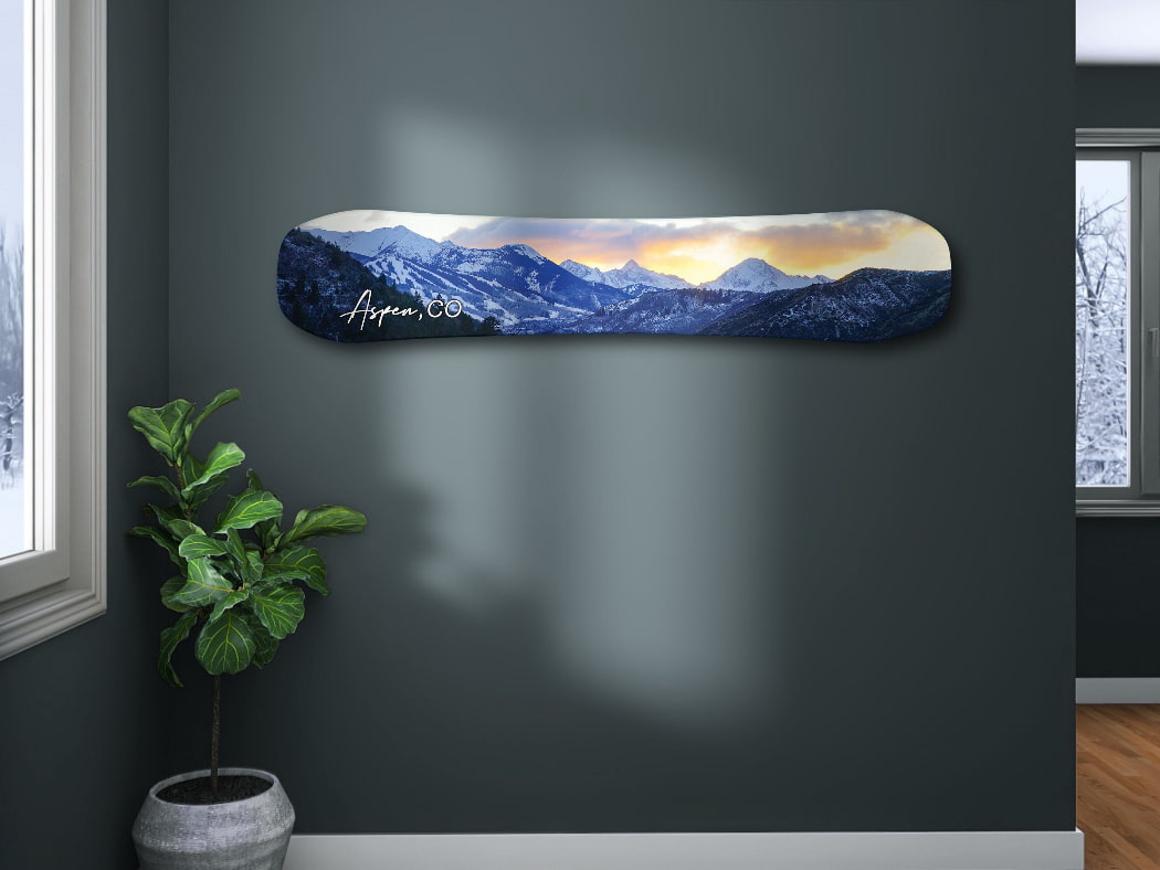 Snowboard Colorado Collection of Mountain Prints | Vail Aspen Telluride Boulder Breckenridge Copper Mountain | Snowboard Wall Décor - Aspen / 35" x 8" is backordered and will ship as soon as it is back in stock.