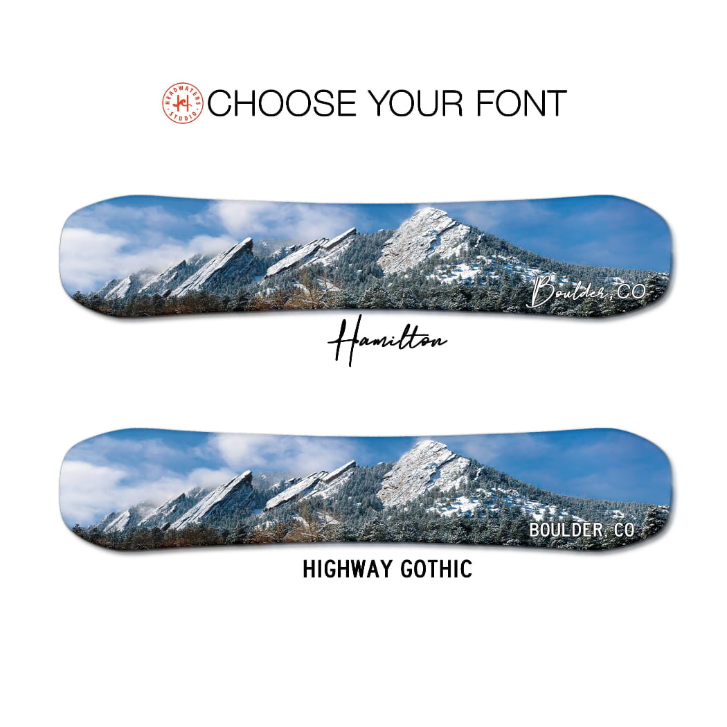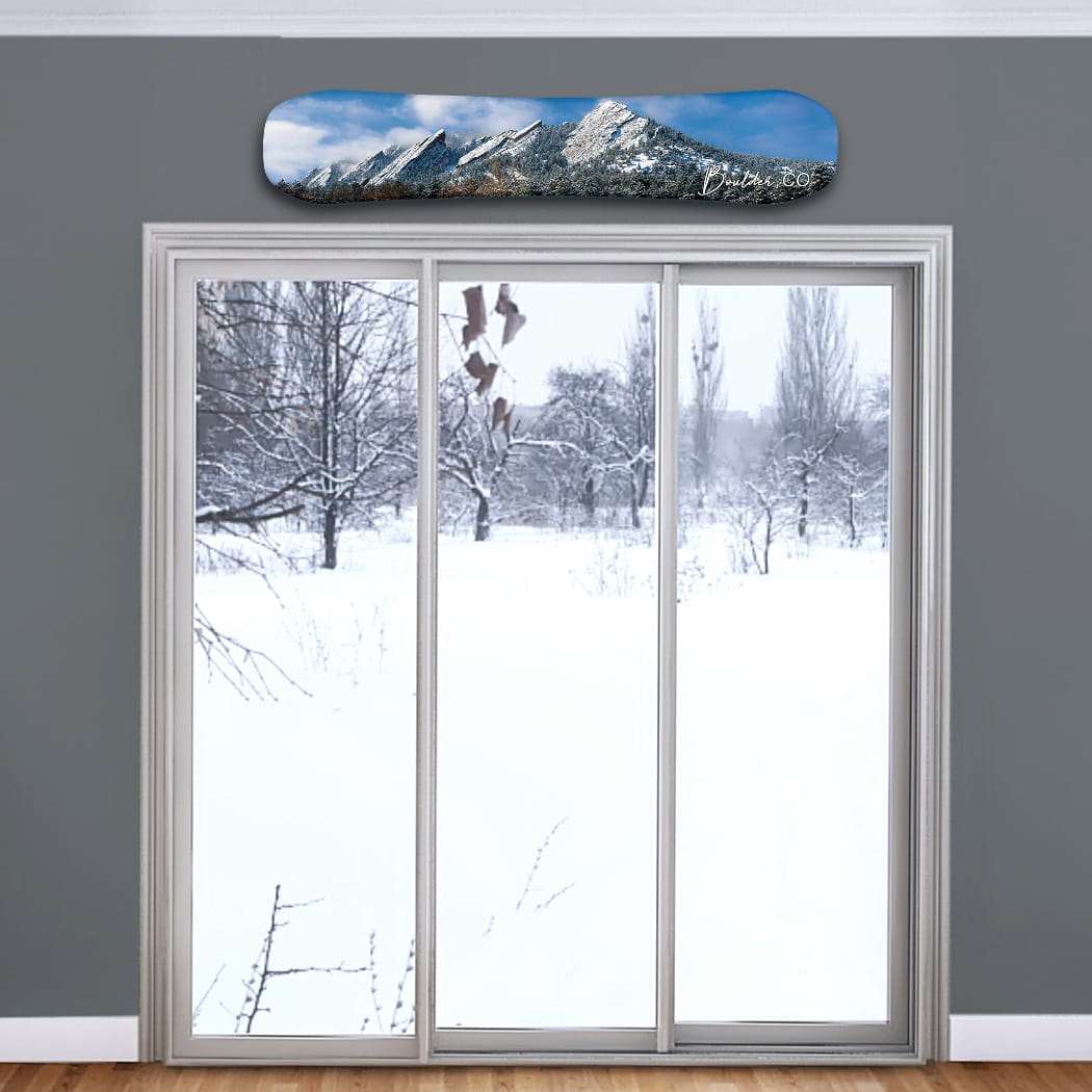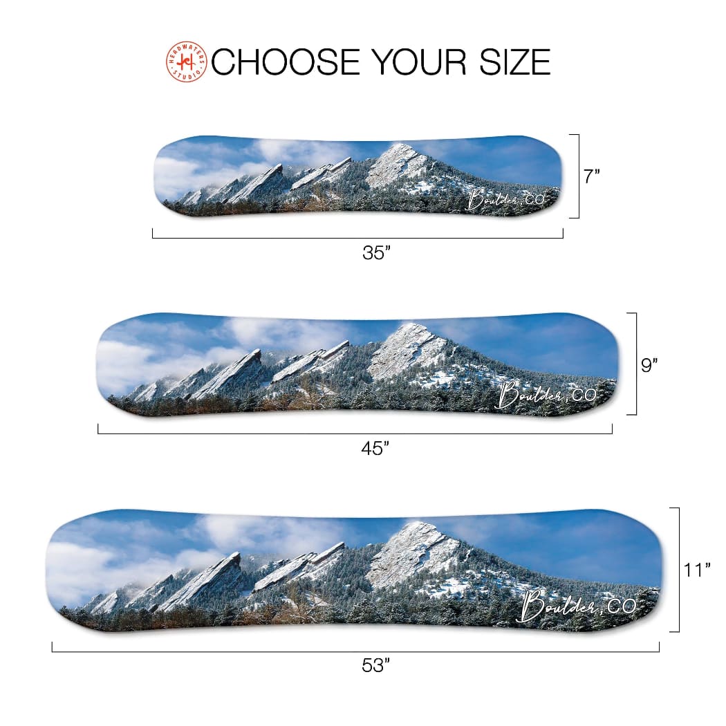 Flatirons Mountain Boulder Snowboard Print | Snowboard Wall Décor | Colorado Skiing - 35" x 8" / NO Text is backordered and will ship as soon as it is back in stock.