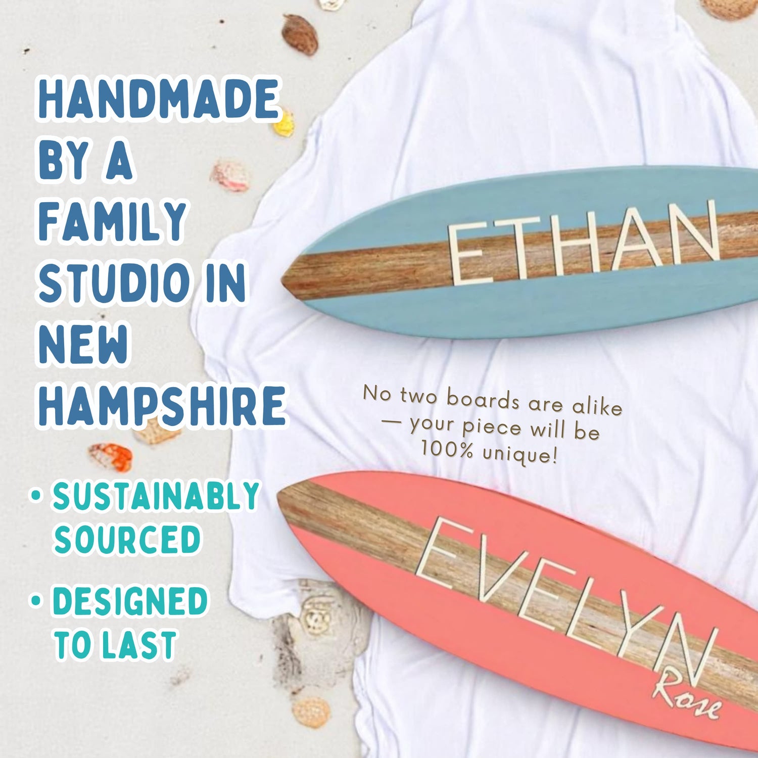 Add a splash of coastal charm with our handcrafted wooden surfboard signs. Perfect as a name sign, baby shower prop, or signature board, each one is a keepsake your family will treasure.
