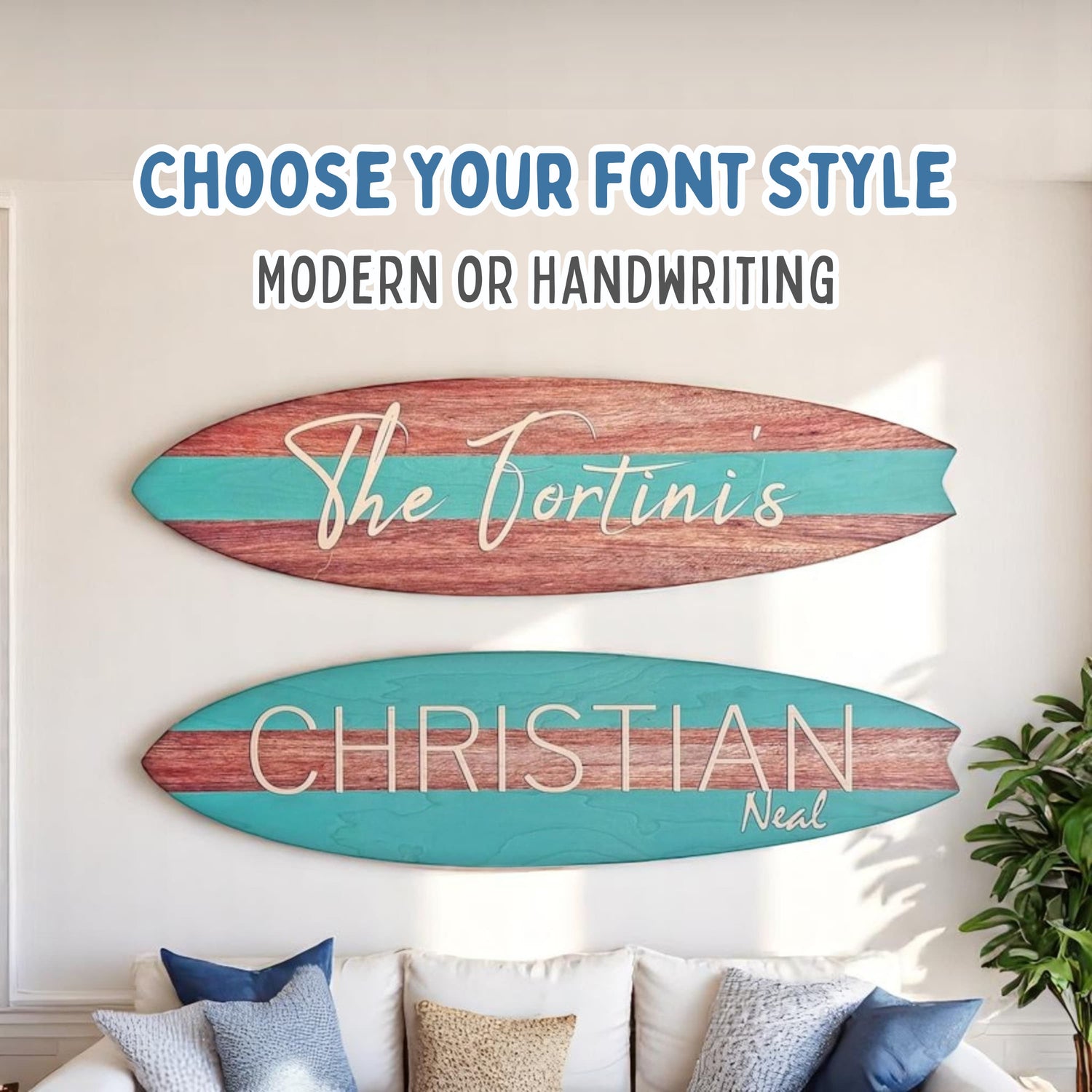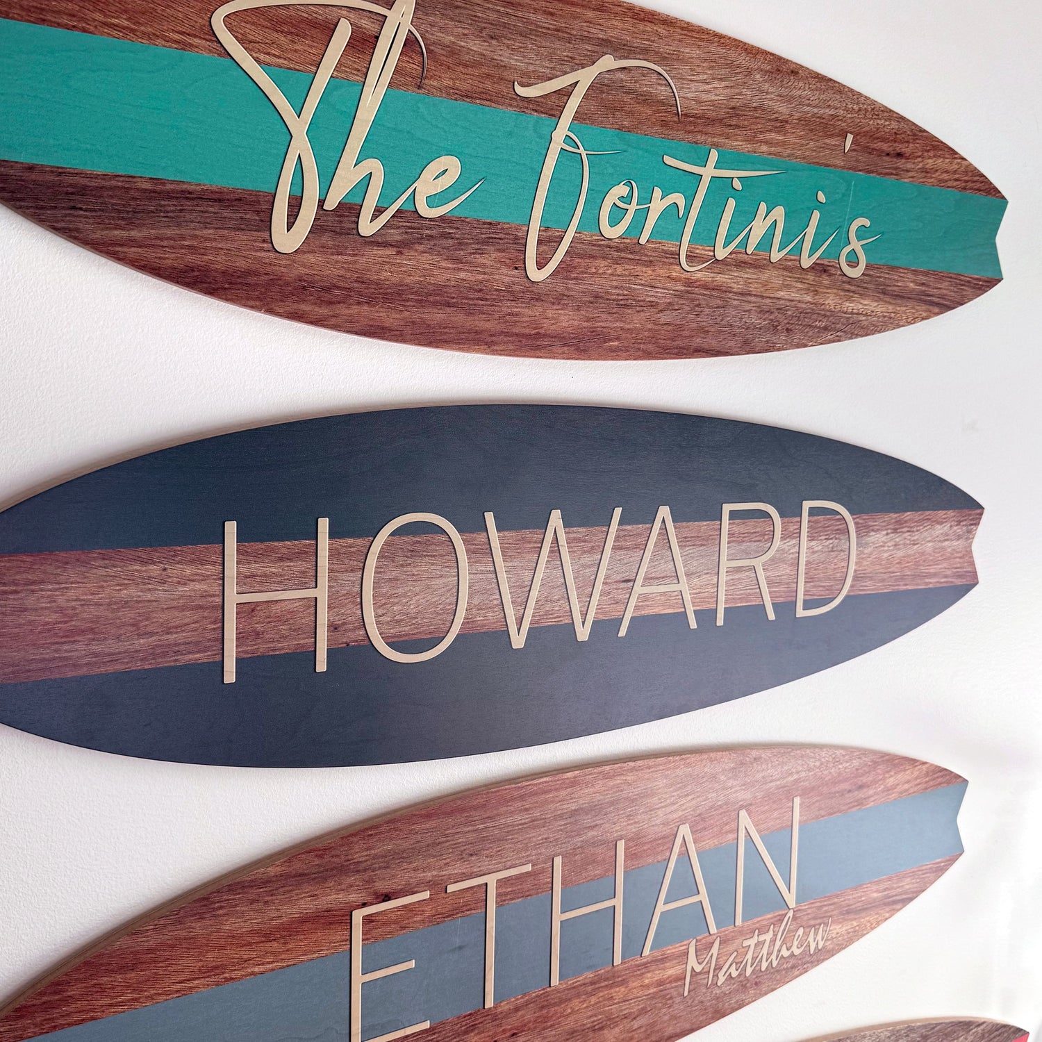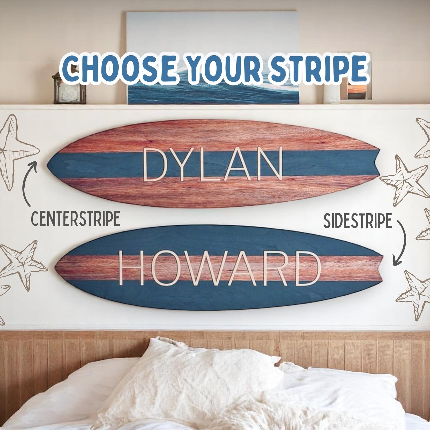 Surfboard Wall Art | Surfboard Name Sign | Party Signature Board | Baby Shower Photo Prop | Light Mahogany with Stripe